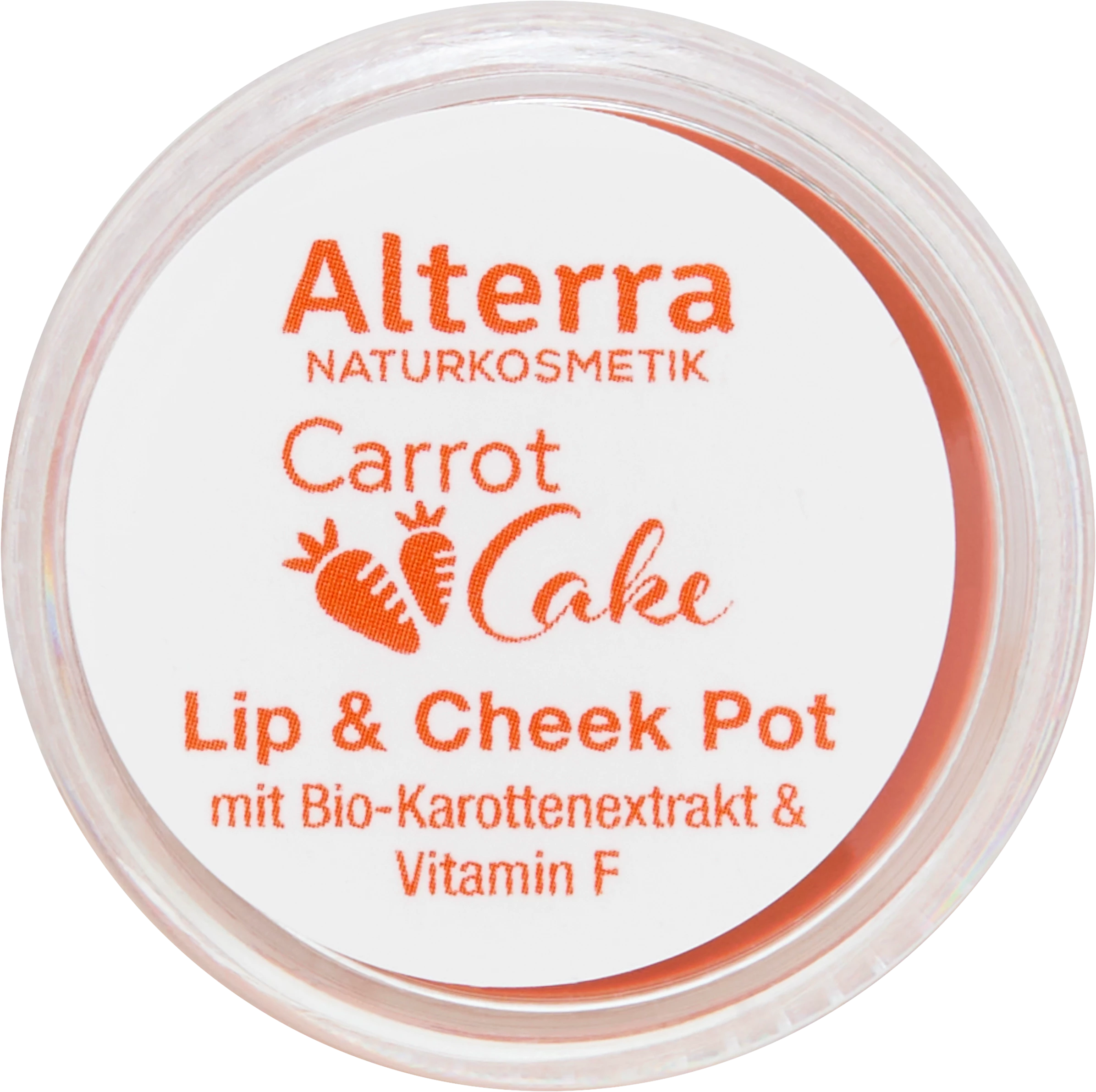 Der Alterra Carrot Cake Lip & Cheek Pot mit Bio-Karottenextrakt & Vitamin F verleiht den Wangen und Lippen einen schimmernden, natürlichen Farbakzent.