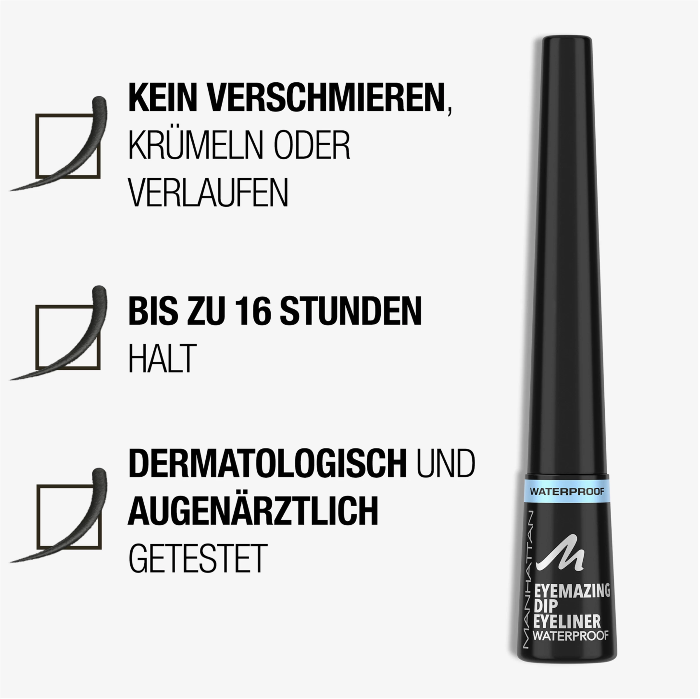 Grafischer Eyeliner oder klassischer Katzenaugen-Look? Der Manhattan Eyemazing Dip Eyeliner Fb. 001 Black Waterproof ist perfekt geeignet für jeden Eyeliner-Look: Der hochpigmentierte Eyeliner überzeugt mit intensivem, matt-schwarzen Finish, das bis zu 16 Stunden hält.