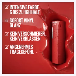 Der flüssige Maybelline New York Super Stay Vinyl Ink Lippenstift kreiert ein sofort glänzendes Vinyl-Finish mit intensiver Farbe und bis zu 16H Halt – ganz ohne zu verschmieren oder zu verblassen! Der Maybelline New York Super Stay Vinyl Ink ist ein absoluter Game Changer! Der flüssige Lippenstift sorgt für intensive Farbe und ein Vinyl-Finish auf den Lippen. Die vegane*, langanhaltende Formel hält bis zu 16 Stunden und verhindert Verschmieren und Verblassen. Hochpigmentierte Farben den ganzen Tag – werde zum absoluten Trendsetter mit dem Vinyl Lippen-Look. *Ohne Inhaltsstoffe tierischen Ursprungs.