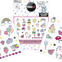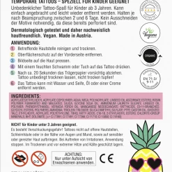 Nicht fĂŒr Kinder unter 3 Jahren geeignet. Es besteht Verschluckungsgefahr! Tattoos nicht auf offene Hautstellen, SchleimhĂ€ute oder in der NĂ€he von Augen und Mund, sowie auf sensibler oder gereizter Haut aufbringen. Bei Auftreten von Irritationen, Anwendung stoppen. Nur unter Aufsicht von Erwachsenen anwenden!